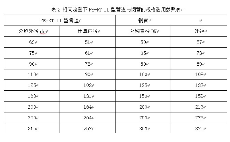 與鋼管比較,PE-RT II型管道的摩擦阻力小,同樣內徑的管材流量是鋼管的1.25倍,隨著鋼管的腐蝕,內壁會變得更加粗糙,流量也會逐年降低,相同流量的情況下,PE-RT II型管道與鋼管的規(guī)格選型見表2