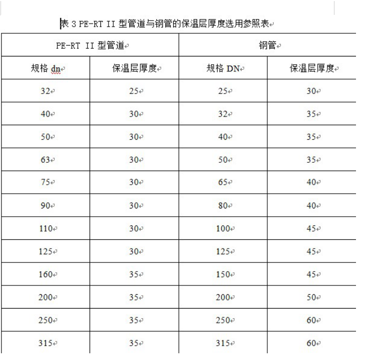 PE-RT II型供熱管道與鋼管相同,都采用工作管、保溫層、外護管三位一體的保溫結構,由于PE-RT II型材料的導熱系數(shù)為鋼管的1%,即管材本身具有較好的保溫性能,且PE-RT II型管道、保溫層、外護管的熱膨脹系數(shù)基本一致,會成為一個整體,不易分層、脫落,管道保溫效果優(yōu)于鋼管,在相同的外界溫度條件下,更節(jié)約保溫材料。以輸送80℃熱水為例,相同流量的外界溫度下,PE-RT II型管道與鋼管的保溫層厚度選型見表3
