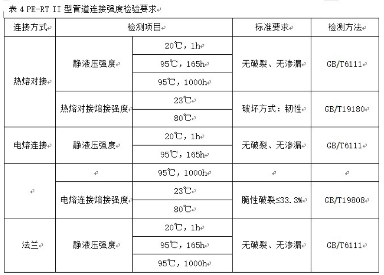 PE-RT II型管材、管件參照GB/T28799-2012執(zhí)行,管道連接強度要求詳見表4